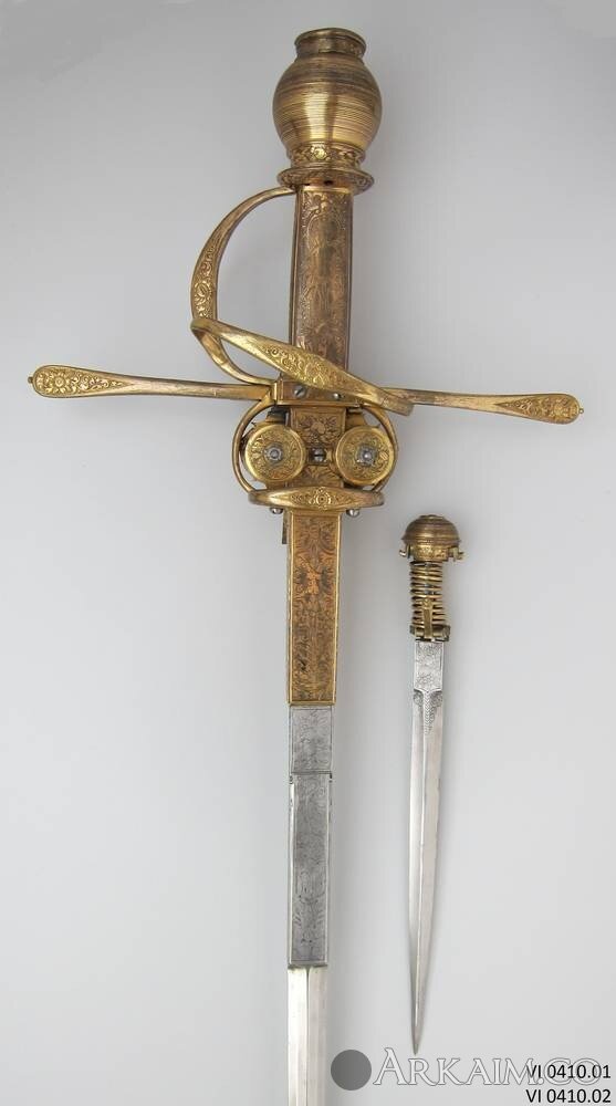 Рапира с подпружиненным клинком, Южная Германия, ок. 1570. Длина 162 см, длина клинка 132 см, вес (вместе с кинжалом) 2,4 кг.