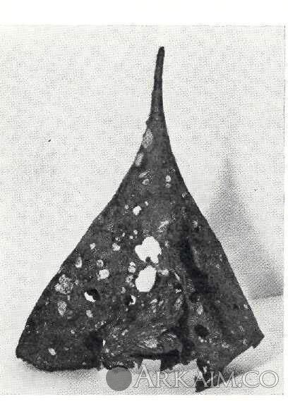 Тулья высокая. Венец гладкий. На венце сохранились заклепки или отверстия для них, использовавшиеся для прикрепления подбоя. Навершие привертное. XV-XVI век.