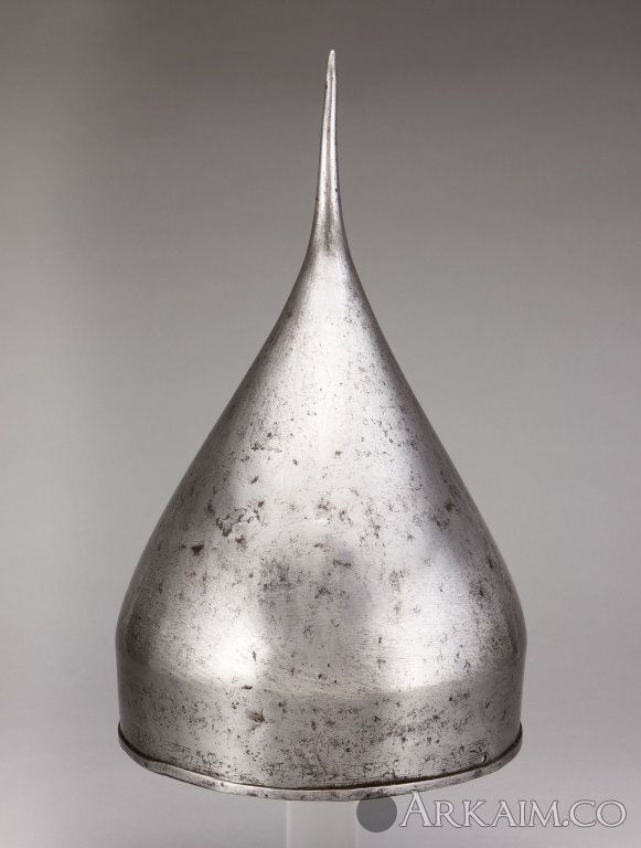 Тулья высокая, коническая, гладкая. Венец гладкий, завальцован. Навершие монолитное. Материал — сталь. XVI век.