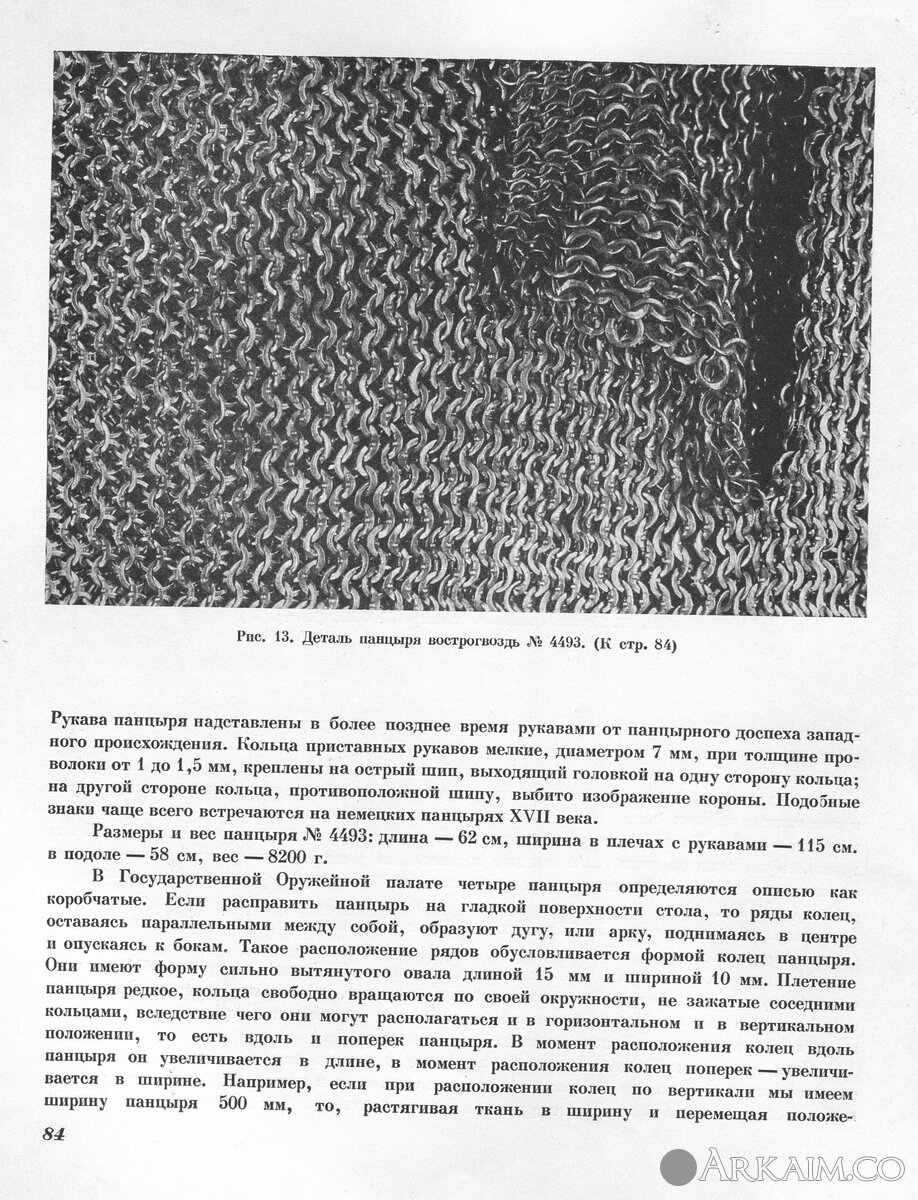 Пансырь XVI пека Ор-4708, названный в описи 1687 года вострогвоздь. Название соответствует виду пансыря. Все кольца клепаны на шип, образующий острую головку на одной стороне кольца. Кольца железные, изготовлены из волоченой проволоки, гладко раскопаны или расплющены. Толщина кольца – 1,5 мм. След штампа наблюдается только на месте заклепки кольца. Судя по плотности скрепленного места, кольца собирались в горячем состоянии и при склепке сваривались. Диаметр колец – от 11 до 12 мм. Ворот, рукава и подол сплетены из более мелких и тонких колец.