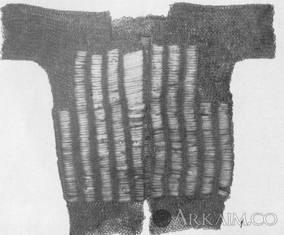 Это бахтерец имеет смещенный центрально-осевой разрез спереди и застегивался на груди. Такая конструкция бахтерцев характерна для т.н. «бахтерцев шамохейских» — бахтерцев ирано-кавказской традиции. Вероятно, центральный грудной приталенный ряд мог использоваться в качечтве подполка. Об этом свидетельствуют заклепки на соседнем ряду. Количство застежек тяжело проследить, но вероятно что их было 4-5. У доспеха в наличии короткие выше локтя рукава и небольшой подол из 19 рядов колец. Сзади подол имеет разрез на 14 колец, вероятно для удобства посадки в седло. Ворот отсутствует. Горловина прямоугольной формы.