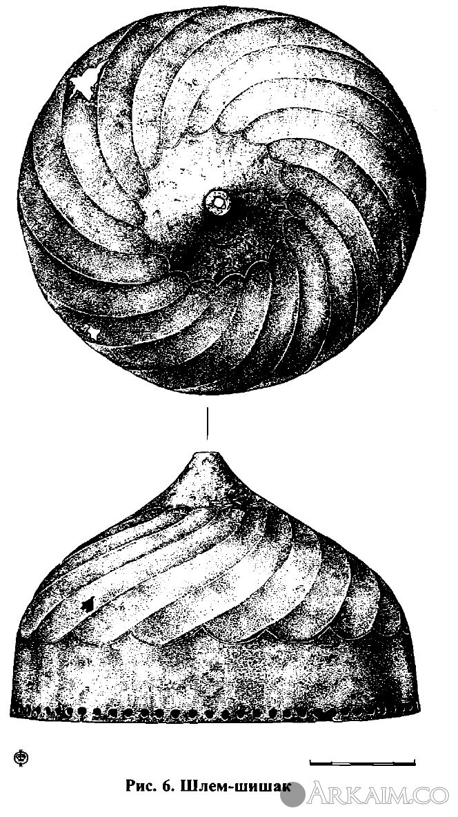 Череп полусферический. Украшен 18 лепестковой розеткой, с расходящимися спиралеобразными лопастями, ограниченными снизу волнообразной полосой. По низу черепу сделано большое количество отверстий для крепления кольчатой бармицы. Шиш отсутствует. Серебряная насечка полностью стерлась. XVI век.