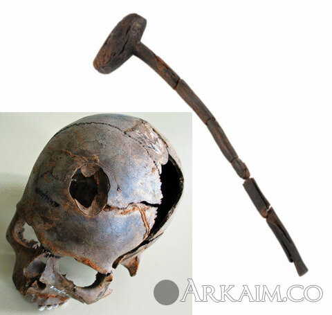 Молот с примером повреждения подобным орудием, дерево. Германия, район р. Толлензе (фото 1)