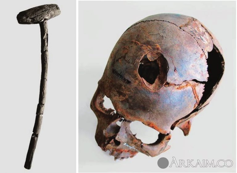 Молот с примером повреждения подобным орудием, дерево. Германия, район р. Толлензе (фото 2)