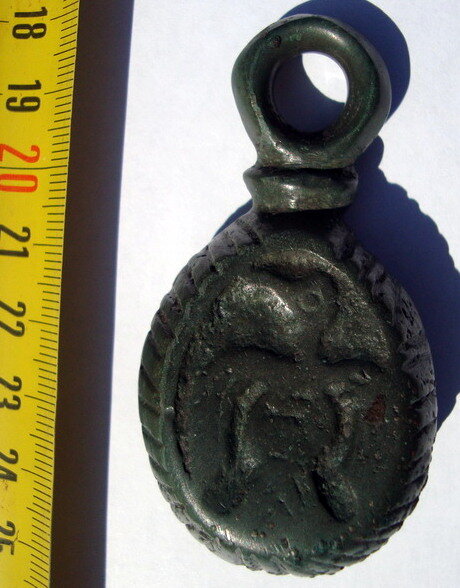 Кистень круглый уплощенный с изображением льва (?) с одной стороны и сокола с другой, тип 3А по Кирпичникову, 224 гр., 12-13 вв. (фото 2)