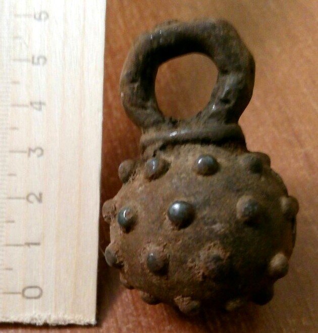 Кистень шаровидный с горошковидными выпуклостями, 116,85 гр., тип 2А по Кирпичникову, 12-13 вв.