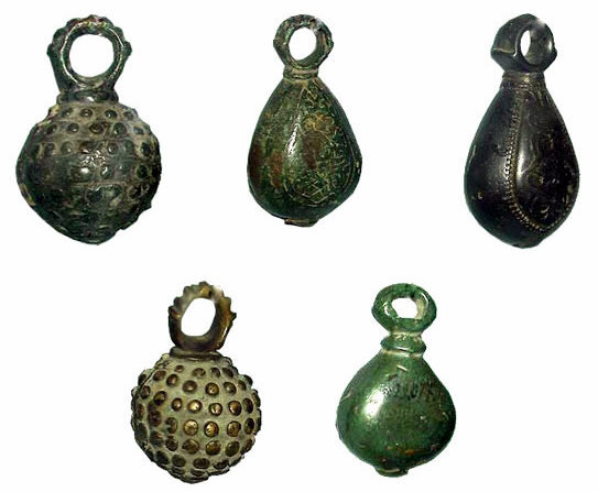 2, 3 - Кистень грушевидный с черненым орнаментом, тип 3 по Кирпичникову, вторая половина 12 -13 вв.