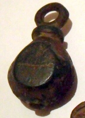Кистень круглый уплощенный с графити в виде креста, тип 3А по Кирпичникову, 12-13 вв.