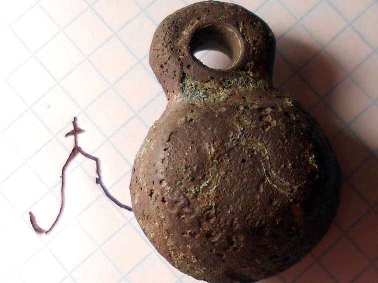 Кистень круглый уплощенный с тамгой, 47,83 гр., тип 3А по Кирпичникову, 12-13 вв. (фото 4)