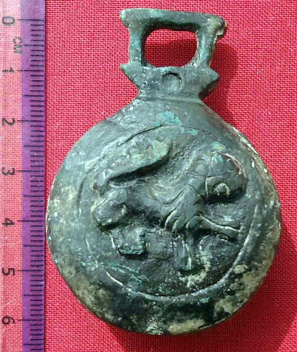 Кистень круглый уплощенный с изображением льва, тип 3А по Кирпичникову, 12-13 вв. (фото 1)