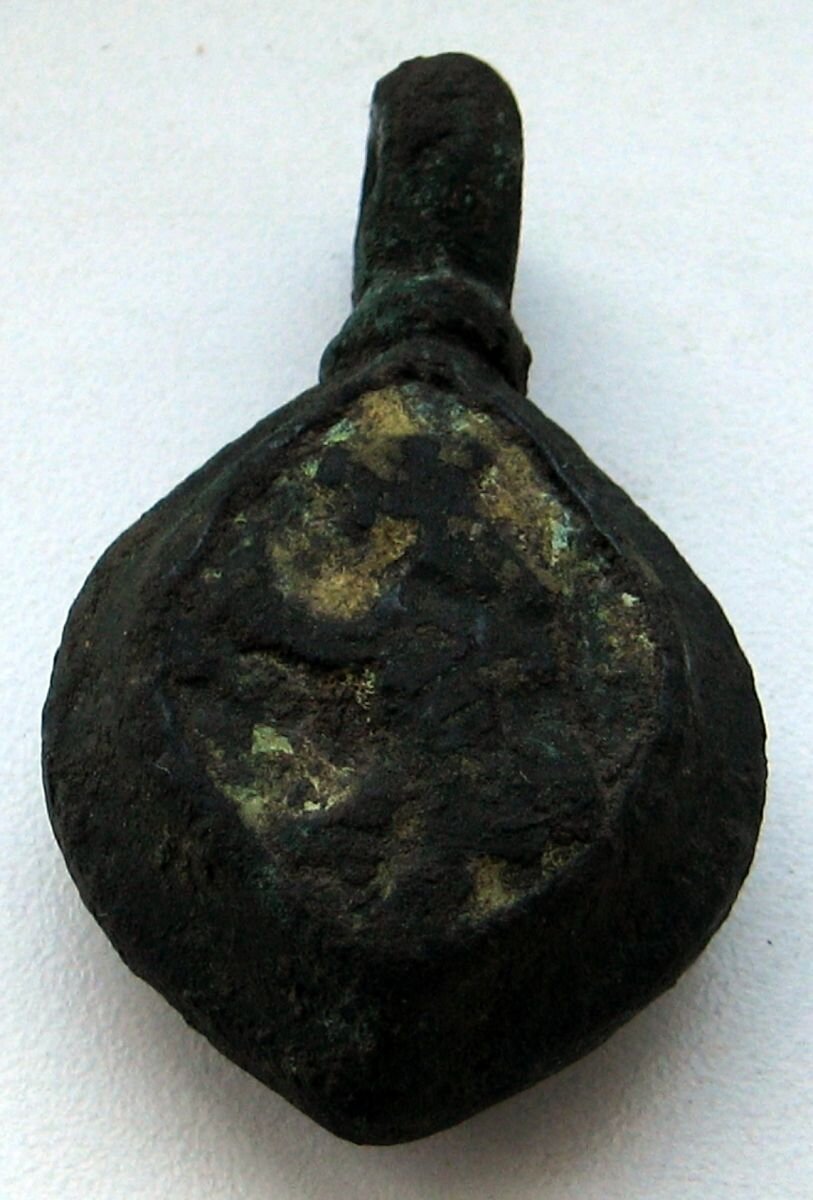 Кистень круглый уплощенный с геральдическими знаками, 137,4 гр., тип 3А по Кирпичникову, 12-13 вв. (фото 1)