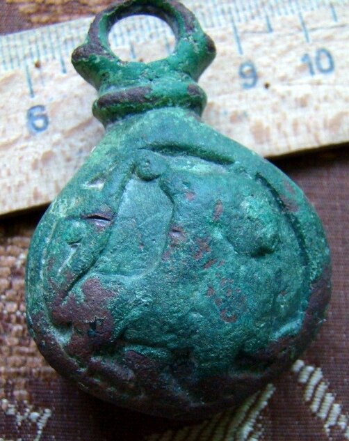 Кистень круглый уплощенный с геральдическими знаками, 158 гр., тип 3А по Кирпичникову, 12-13 вв. Киевская обл. (фото 2)