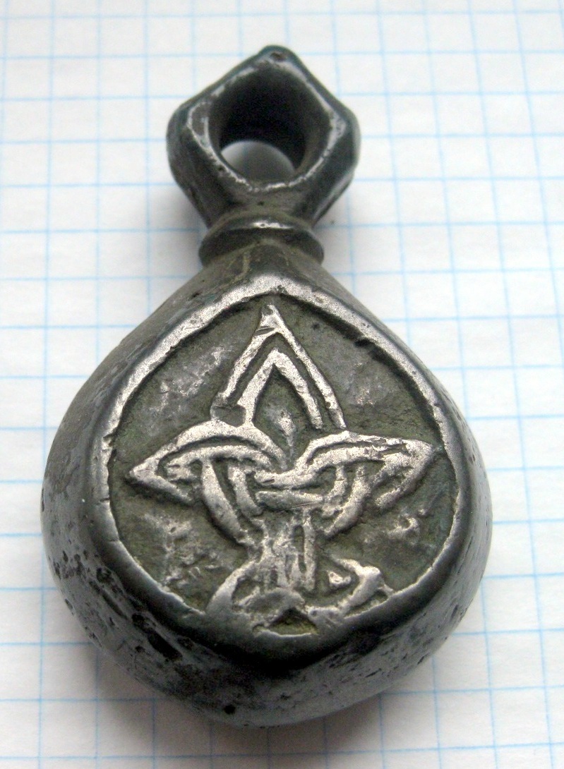 Кистень круглый уплощенный с геральдическими знаками, 173 гр., тип 3А по Кирпичникову, 12-13 вв. Ровенская обл. (фото 1)