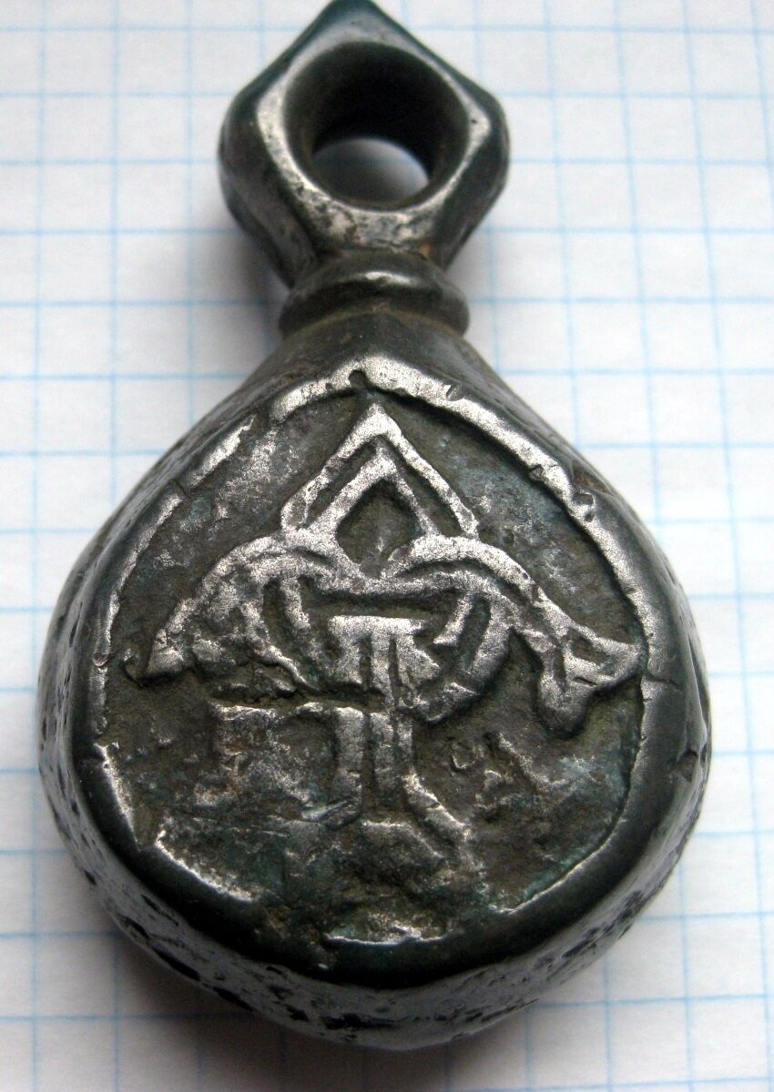 Кистень круглый уплощенный с геральдическими знаками, 173 гр., тип 3А по Кирпичникову, 12-13 вв. Ровенская обл. (фото 2)