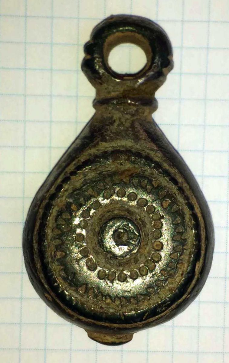 Кистень круглый уплощенный с геральдическими знаками, 129 гр., тип 3А по Кирпичникову, 12-13 вв. (фото 1)