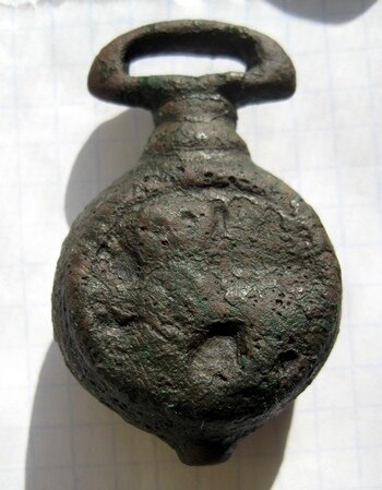 Кистень круглый уплощенный с геральдическими знаками, 87,35 гр., тип 3А по Кирпичникову, 12-13 вв. Хмельницкая обл. (фото 1)