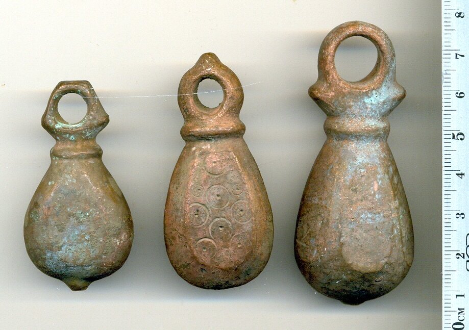 Кистени грушевидные уплощенные с циркульным орнаментом (средний), тип 3 по Кирпичникову, вторая половина 12 - 13 вв.