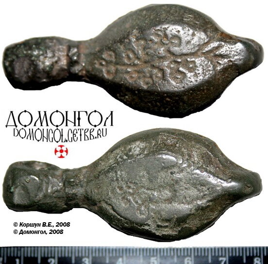 Кистень грушевидный уплощенный с геральдическими знаками, тип 3А по Кирпичникову, 12-13 вв.