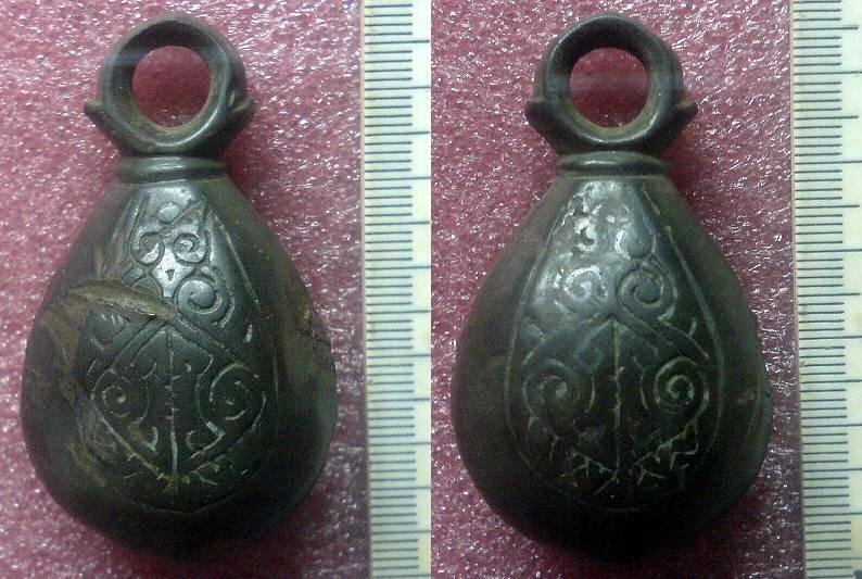 Кистень грушевидный уплощенный с черневым орнаментом, тип 3 по Кирпичникову, вторая половина 12 - 13 вв.
