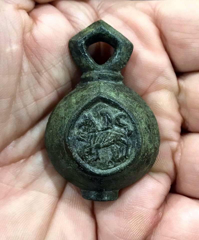 Кистень круглый уплощенный с геральдическими знаками - грифон и пегас, тип 3А по Кирпичникову, 12-13 вв. (фото 2)
