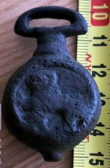 Кистень круглый уплощенный с геральдическими знаками, 98,4 гр., тип 3А по Кирпичникову, 12-13 вв. Киевская обл.
