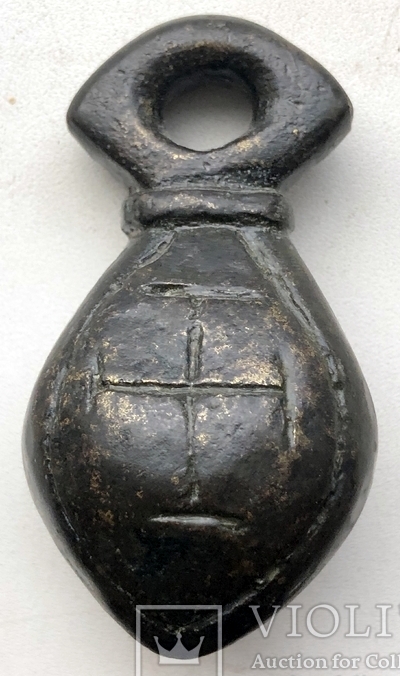 Кистень грушевидный уплощенныйс графити в виде креста, тип 3А по Кирпичникову, 12-13 вв. Николаевская обл.