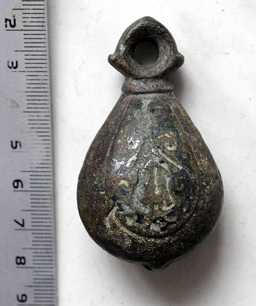 Кистень грушевидный уплощенный с черневым орнаментом, тип 3 по Кирпичникову, вторая половина 12-13 вв. (фото 1)