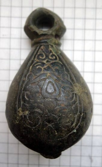 Кистень грушевидный уплощенный с черневым орнаментом, тип 3 по Кирпичникову, вторая половина 12-13 вв. (фото 2)