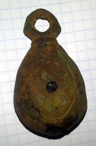 Кистень грушевидный уплощенный с черневым орнаментом, тип 3 по Кирпичникову, вторая половина 12-13 вв. (фото 1)