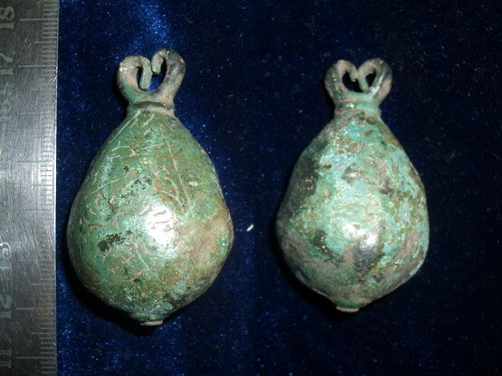 Кистени грушевидные уплощенные с черневым орнаментом, тип 3 по Кирпичникову, вторая половина 12 - 13 вв.
