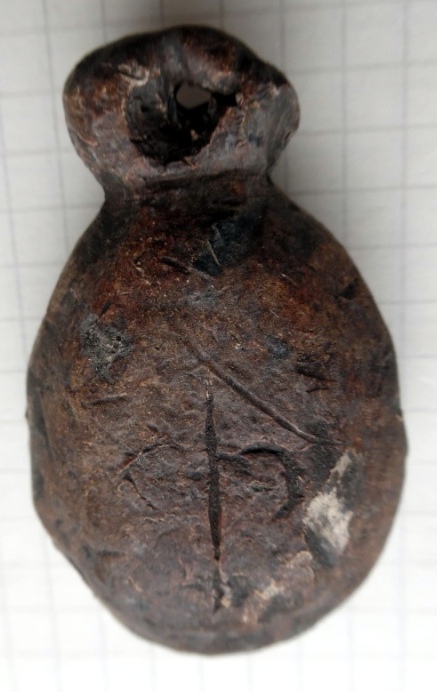 Кистень грушевидный уплощенный с графити, свинец, тип 3А по Кирпичникову, вторая половина 12-13 вв. (фото 1)