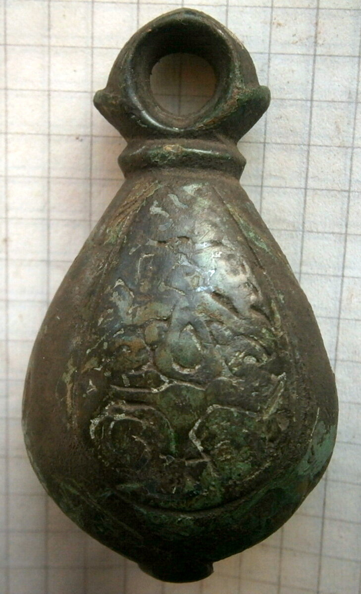 Кистень грушевидный уплощенный с черневым орнаментом, 100 гр., тип 3 по Кирпичникову, вторая половина 12-13 вв. (фото 1)