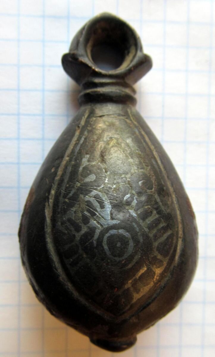 Кистень грушевидный уплощенный с черневым орнаментом, 74,84 гр., тип 3 по Кирпичникову, вторая половина 12-13 вв. (фото 1)