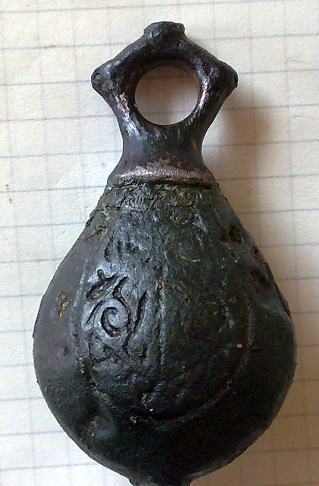 Кистень грушевидный уплощенный с черневым орнаментом, тип 3 по Кирпичникову, вторая половина 12-13 вв. (фото 1)