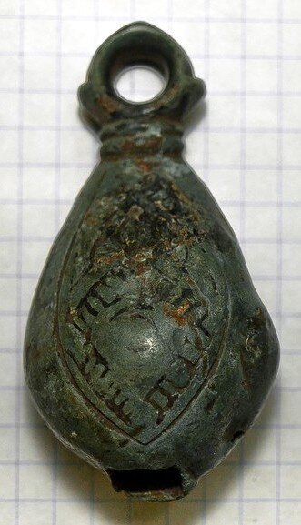 Кистень грушевидный уплощенный с черневым орнаментом, тип 3 по Кирпичникову, вторая половина 12-13 вв. (фото 1)