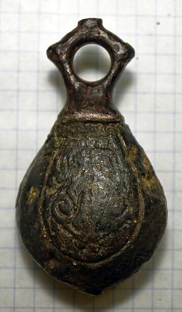 Кистень грушевидный уплощенный с черневым орнаментом, тип 3 по Кирпичникову, вторая половина 12-13 вв. (фото 1)