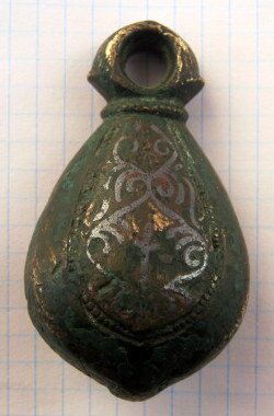 Кистень грушевидный уплощенный с черневым орнаментом, тип 3 по Кирпичникову, вторая половина 12-13 вв. (фото 1)