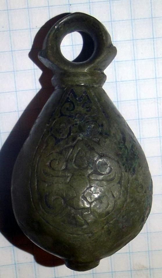 Кистень грушевидный уплощенный с черневым орнаментом, 86 гр., тип 3 по Кирпичникову, вторая половина 12-13 вв. (фото 2)