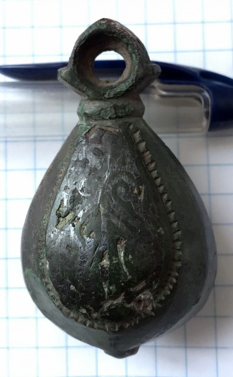 Кистень грушевидный уплощенный с черневым орнаментом, тип 3 по Кирпичникову, вторая половина 12-13 вв. (фото 1)