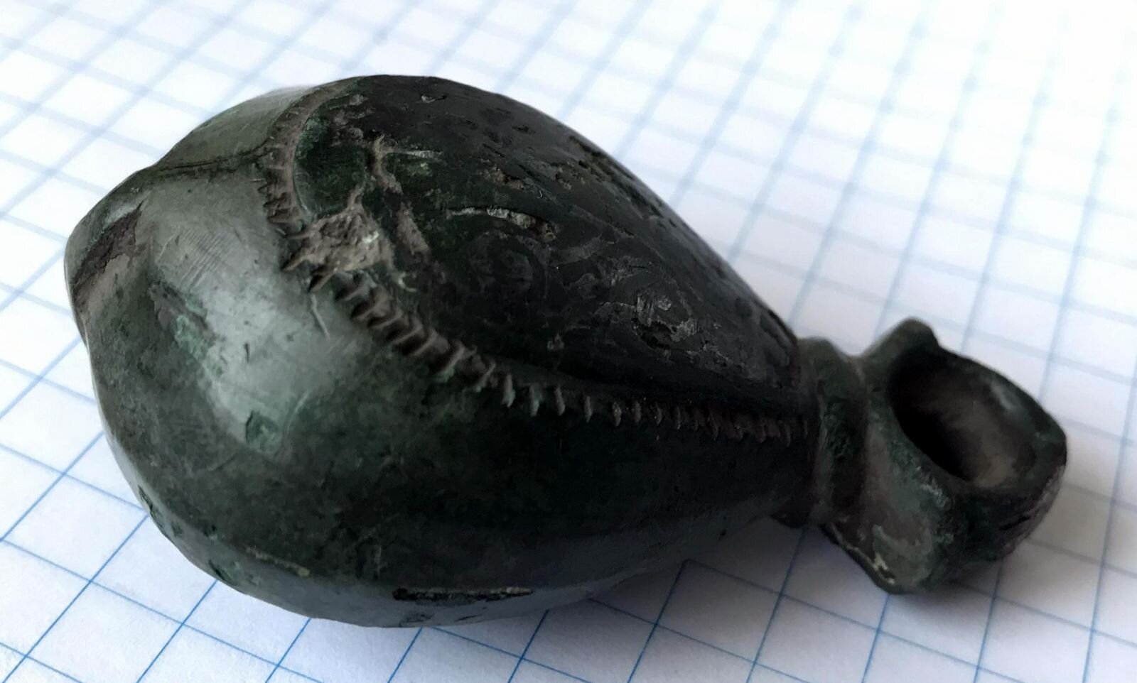 Кистень грушевидный уплощенный с черневым орнаментом, тип 3 по Кирпичникову, вторая половина 12-13 вв. (фото 3)