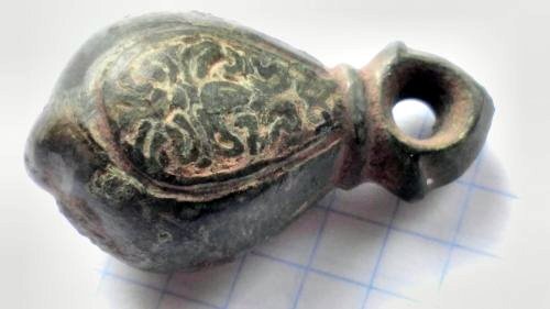 Кистень грушевидный уплощенный с черненым орнаментом, 22,86 гр., тип 3 по Кирпичникову, вторая половина 12-13 вв. Волынская обл.