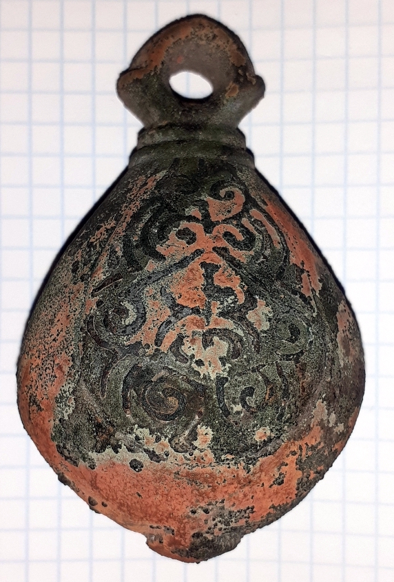 Кистень грушевидный уплощенный с черненым орнаментом, тип 3 по Кирпичникову, вторая половина 12-13 вв. (фото 1)
