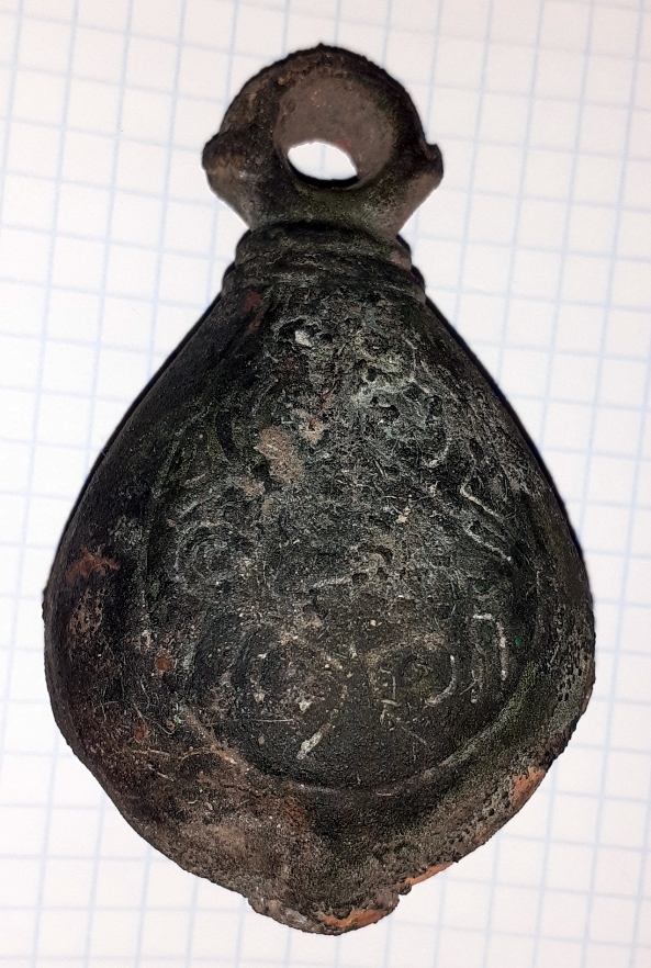 Кистень грушевидный уплощенный с черненым орнаментом, тип 3 по Кирпичникову, вторая половина 12-13 вв. (фото 2)
