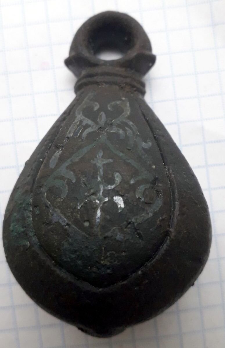 Кистень грушевидный уплощенный с черненым орнаментом, 180 гр., тип 3 по Кирпичникову, вторая половина 12-13 вв. (фото 1)