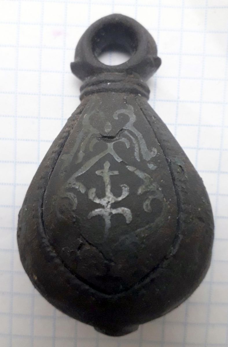 Кистень грушевидный уплощенный с черненым орнаментом, 180 гр., тип 3 по Кирпичникову, вторая половина 12-13 вв. (фото 2)