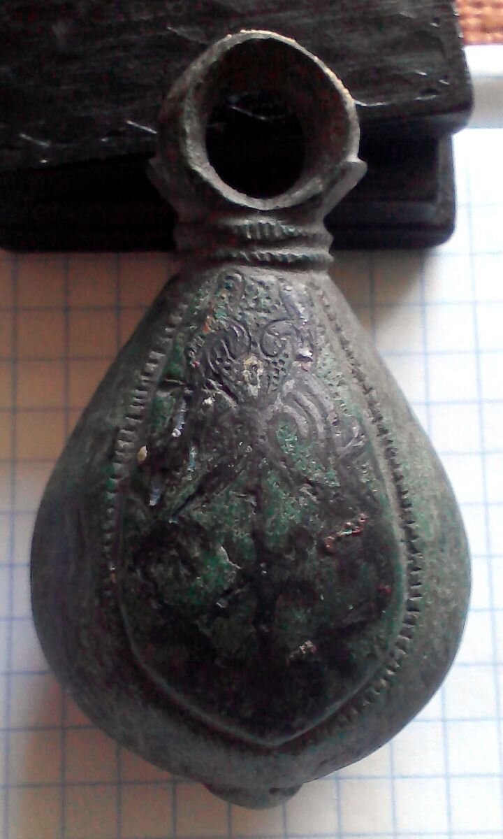 Кистень грушевидный уплощенный с черненым орнаментом, тип 3 по Кирпичникову, вторая половина 12-13 вв. (фото 1)