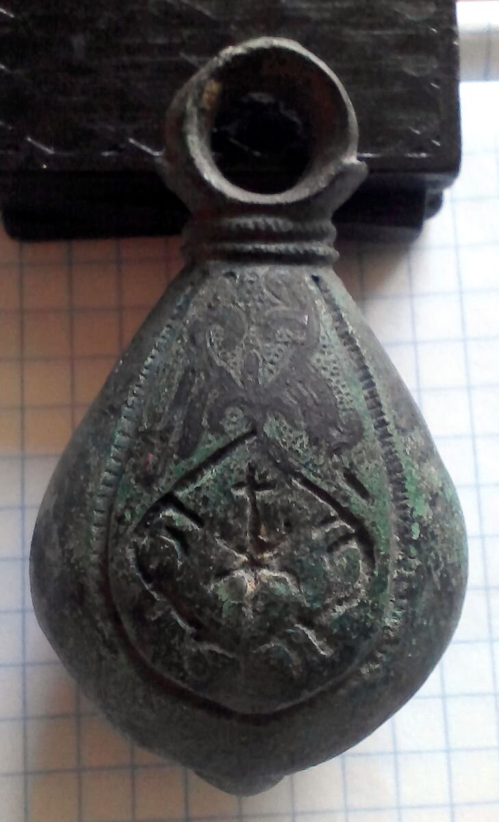 Кистень грушевидный уплощенный с черненым орнаментом, тип 3 по Кирпичникову, вторая половина 12-13 вв. (фото 2)