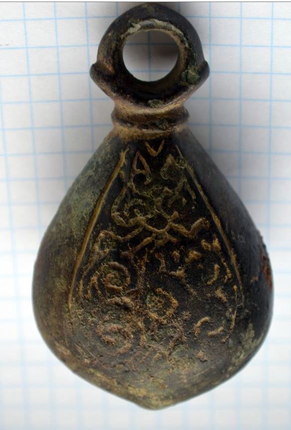 Кистень грушевидный уплощенный с черненым орнаментом, 141 гр., тип 3 по Кирпичникову, вторая половина 12-13 вв.