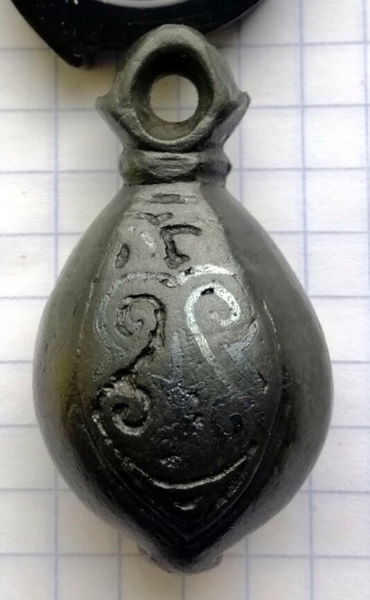 Кистень грушевидный уплощенный с черненым орнаментом, 27,3 гр., тип 3 по Кирпичникову, вторая половина 12-13 вв.