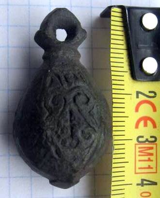 Кистень грушевидный уплощенный с черненым орнаментом, тип 3 по Кирпичникову, вторая половина 12-13 вв. Черкасская обл.